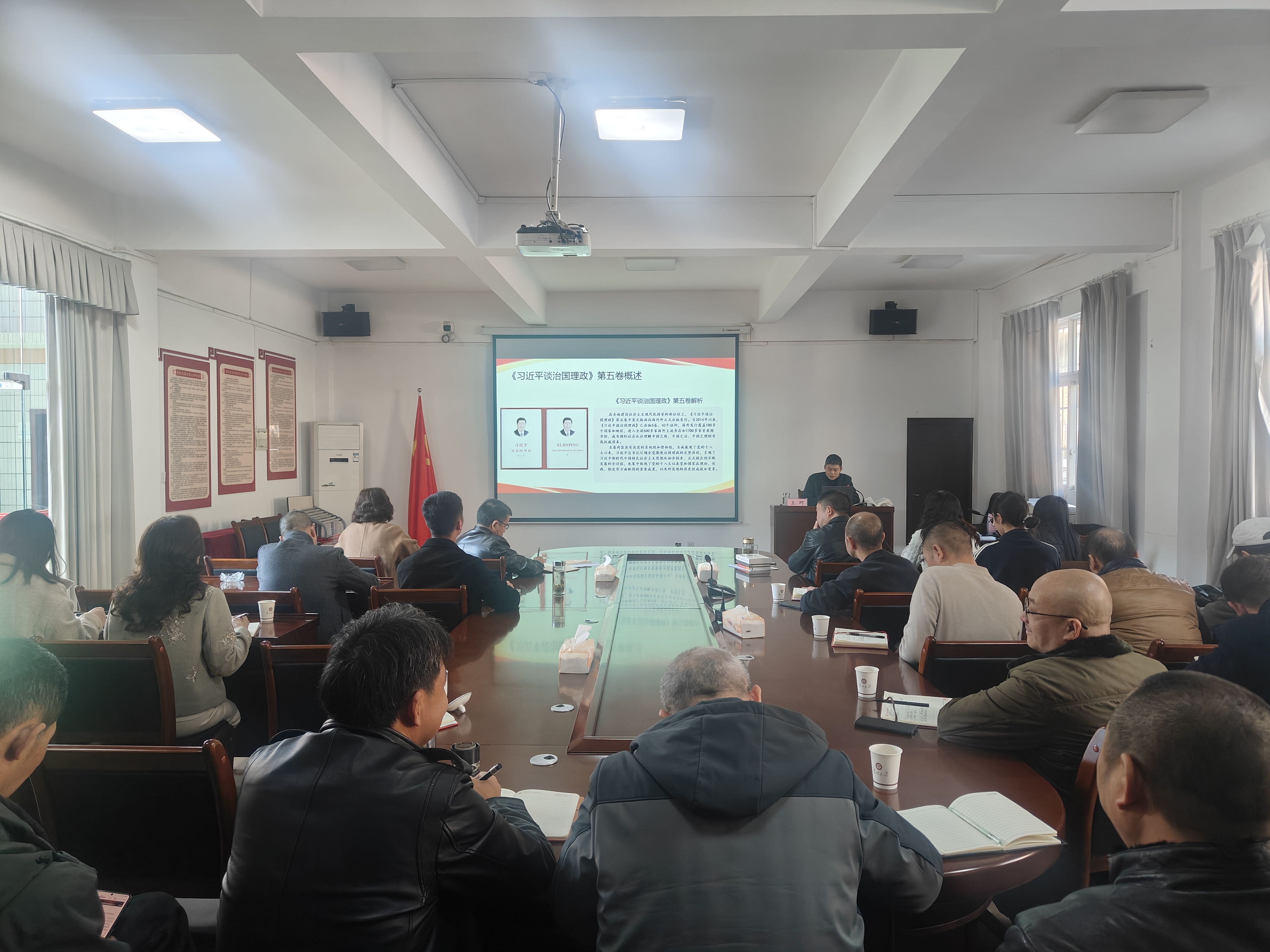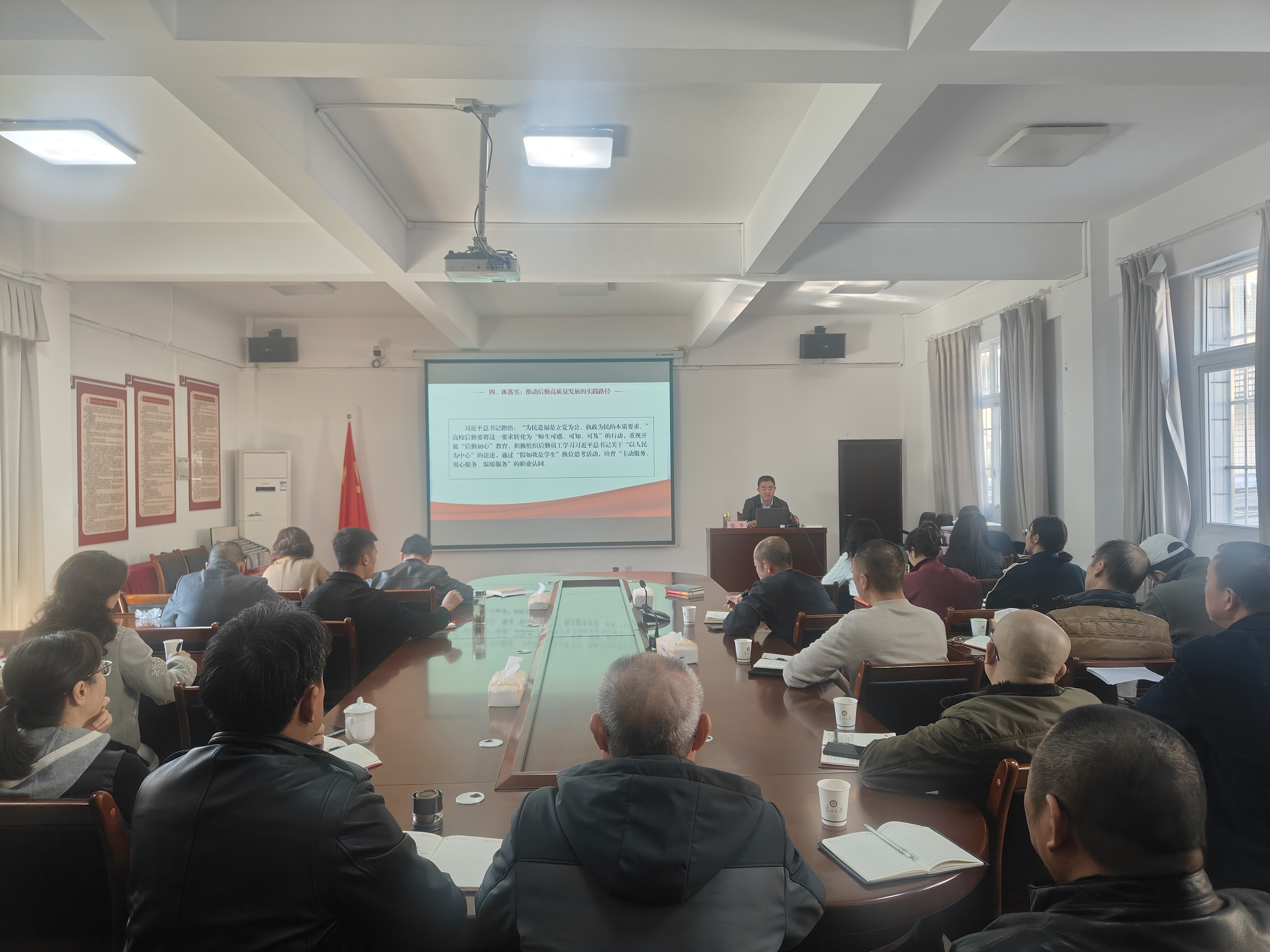 2025年11月21日,贵州大学科技产业党委“深入学习《习近平谈治国理政》(第五卷) 推动后勤服务保障高质量发展”理论宣传二人讲活动在后勤管理处第二会议室正式开讲。科技产业党委书记王珂,科技产业党委委员、后勤管理处处长张华联合宣讲,以“一人讲理论、一人讲实践”的模式,将以人民为中心的发展思想与后勤实践深度融合,让党的创新理论在基层落地生根。